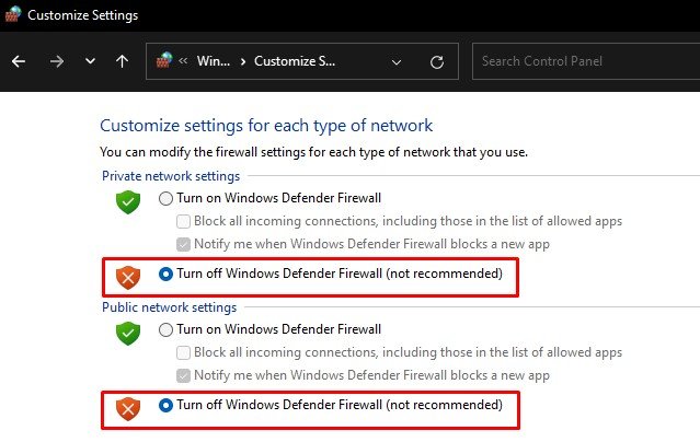 Selecione Desativar o Firewall do Windows Defender (não recomendado) para configurações de rede privada e pública.