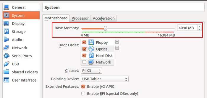 Clique com o botão direito do mouse na máquina virtual criada e selecione Configurações. No Virtual Box, clique em Sistema e selecione >Motherboard. Agora, arraste a barra ou digite o tamanho da memória conforme sua necessidade.