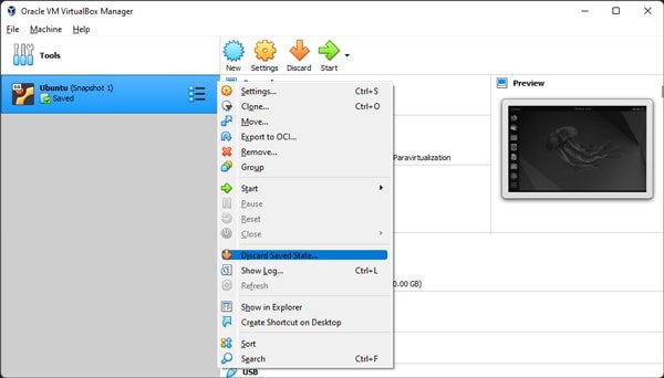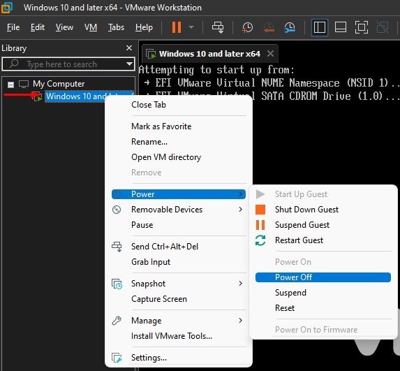 No VMware, clique com o botão direito do mouse no arquivo salvo máquina, vá para ligar e selecione Desligar.