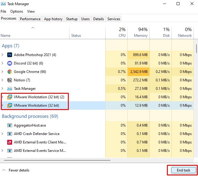 Pressione Ctrl + Shift + Esc para abrir o Gerenciador de tarefas. Na guia Processos, encontre o nome do hipervisor que você está usando e clique em Finalizar tarefa .