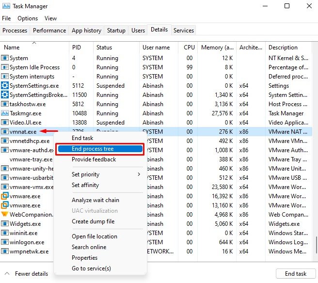 Da mesma forma, identifique o ID do processo da máquina virtual, como vmwp.exe, na guia Detalhes. Clique com o botão direito nele e selecione Finalizar árvore do processo. Às vezes, você pode precisar fazer isso uma ou mais vezes.