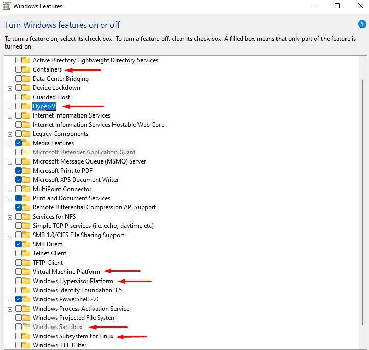 Pressione Windows +’R’e digite optionalfeatures para abrir Recursos do Windows. Localizar os recursos a seguir e desmarque todos eles.Plataforma Hyper-VWindows HypervisorPlataforma de máquina virtualWindows SandboxWindows Subsystem for Linux