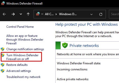 Pressione Windows +’R’para abrir a caixa de diálogo Executar. Digite firewall.cpl para abrir o Firewall do Windows Defender strong>.Clique em Ativar ou desativar o Firewall do Windows Defender.