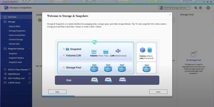 Como o nome indica, o pool de armazenamento é a capacidade agregada das unidades na configuração do NAS. Você terá a opção de selecionar quais unidades usar e qual nível de RAID também.