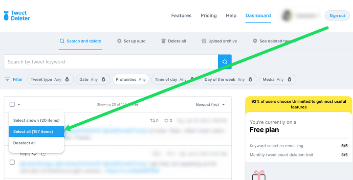 Tweet Deleter permite que você navegue rapidamente pelos seus tweets, incluindo retuítes, e selecione e exclua muitos dos de uma só vez, e você pode até configurar a exclusão automática. Ele remove os tweets para sempre, para que eles não fiquem mais visíveis para ninguém. A versão gratuita limita o número de tweets apagáveis por dia, enquanto a opção premium oferece 3.000 exclusões e a ilimitada oferece infinito.
