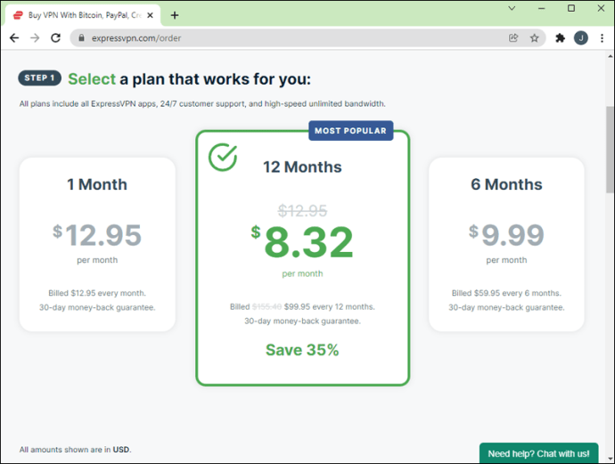 Selecione uma ExpressVPN adequada planeje, compre e registre seguindo as instruções na tela.