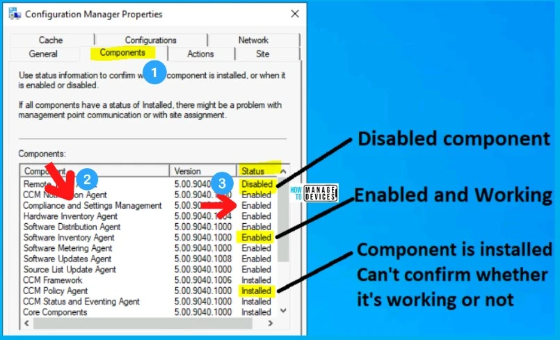 No lado do cliente, você pode abrir o miniaplicativo Configuration Manager no painel de controle ou tentar executar o seguinte comando no RUN menu para abrir o applet ConfigMgr. Verifique a guia Componentes e confirme se o componente Gerenciamento de conformidade e configurações está ATIVADO.