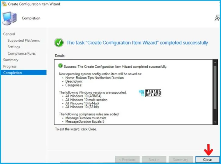 Clique em Avançar na guia Regras de conformidade e Resumo e encerre o Assistente de criação de item de configuração por clicando em Fechar na Guia Conclusão.