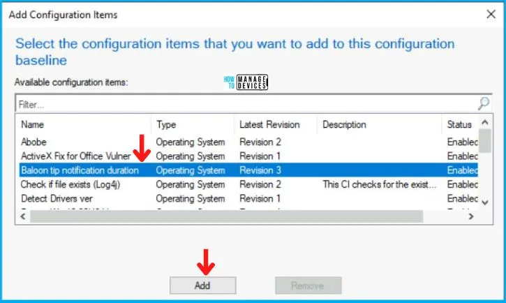 No Criar linha de base de configuração, digite o nome da linha de base e clique em Adicionar para adicionar o item de configuração criado anteriormente, conforme mostrado na imagem abaixo.