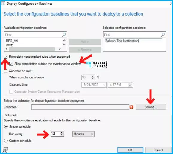 strong> Selecione Programação simples e defina Executar a cada para 12 minutos conforme mostrado abaixo na imagem. Observe que isso pode variar de ambiente de produção para ambiente. Como estou realizando isso em meu ambiente de laboratório, escolho 5 minutos. Depois disso, clique em Procurar para selecionar a coleção de dispositivos mostrada abaixo.