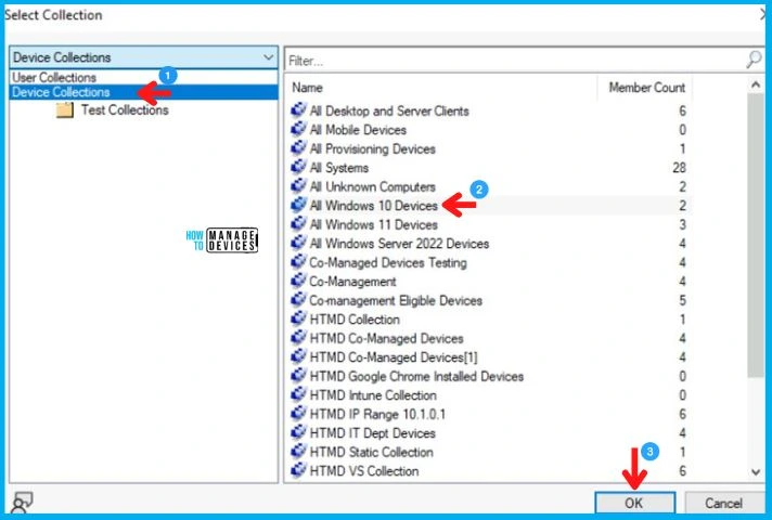 Agora escolha a coleção de dispositivos conforme mostrado abaixo na imagem. Aqui escolho a coleção de dispositivos Windows 11 para implantar a linha de base de configuração do SCCM.