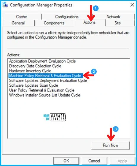 Agora, ao fazer login no dispositivo Windows 10/11 , abra o miniaplicativo Gerenciador de configuração no painel de controle e selecione a guia Ação. Agora escolha o Ciclo de recuperação e avaliação do Machine Policy e clique em Executar agora, conforme mostrado abaixo na imagem.