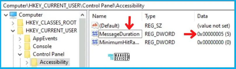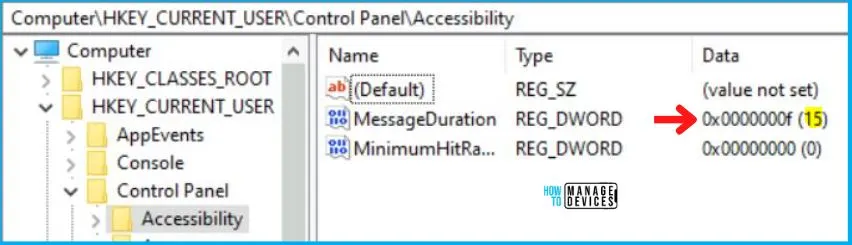 HKEY_CURRENT_USER\Control Panel\Accessibility\MessageDuration