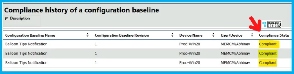 Assim, o que você vê acima, a linha de base de configuração do item de configuração que criamos funciona perfeitamente na coleção de dispositivos Windows 10/11.