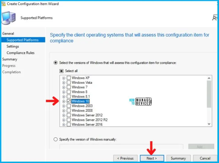 Aqui na guia Plataformas Suportadas, selecione a versão do sistema operacional para o qual você deseja criar o CI. Aqui estou escolhendo Windows 11 e clicando em “Próximo, “como mostrado abaixo.