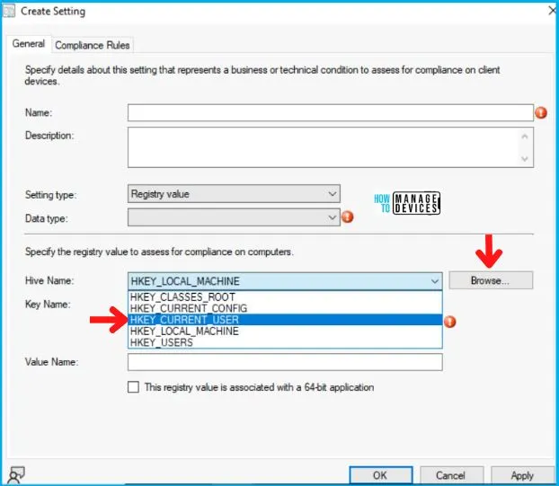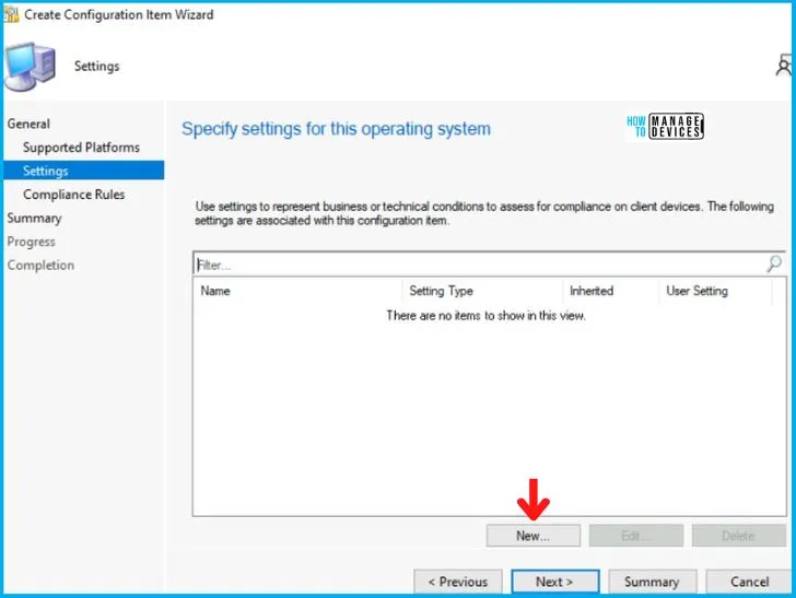 Navegue até o Console do SCCM \ Ativos e conformidade \ Configurações de conformidade \ Itens de configuraçãoClique com o botão direito do mouse em Itens de configuração e selecione’Criar item de configuração’