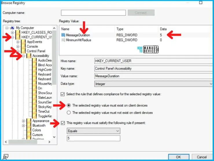 Como você pode ver na imagem acima, MessageDuration é o chave de registro que, por padrão, é definida como 5. Verificaremos e corrigiremos isso para 15 com a ajuda do item de configuração que estamos prestes a criar.