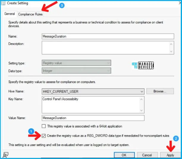 Agora clique na guia Configurações e você verá seu Item de configuração na lista. Então agora clique em Avaliar, como mostrado abaixo na imagem. No momento em que você clicar em Avaliar, ele verificará se MessageDuraton está definido como 5 e o corrigirá para 15. Como você pode ver na imagem abaixo, ele retorna Compliant.