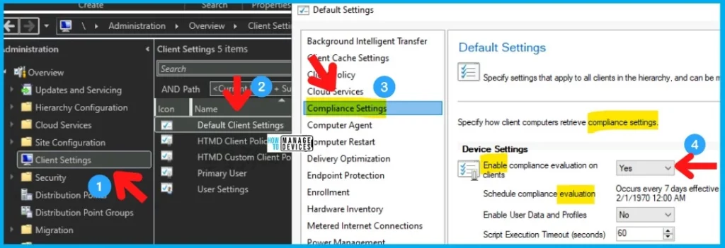 Navegue até \Administration\Overview\Client Settings.Abra o Configurações do cliente implantadas em clientes Windows 11 ou 10. Clique na guia Configurações de conformidade e marque: Ativar avaliação de conformidade em clientes=Sim , conforme mostrado na captura de tela abaixo.