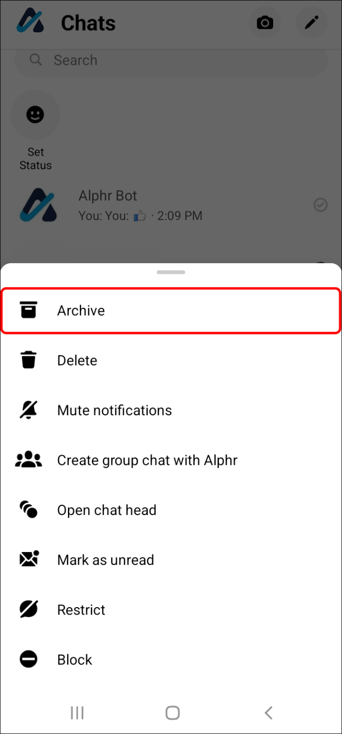 Pressione e segure o bate-papo e selecione”Arquivar”