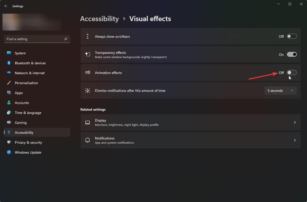 Para desativar todas as animações no Windows 11, desative a opção”Efeitos visuais”.