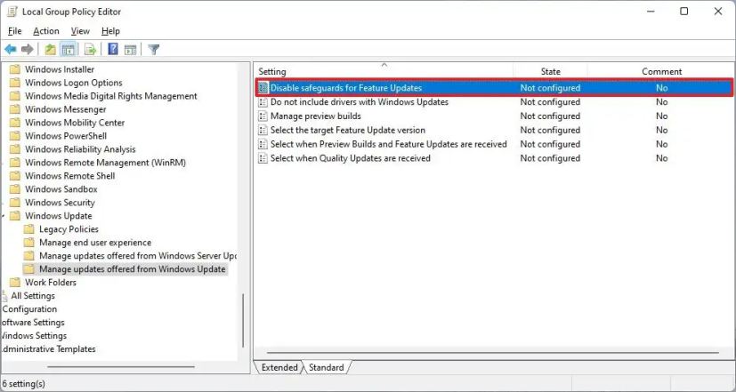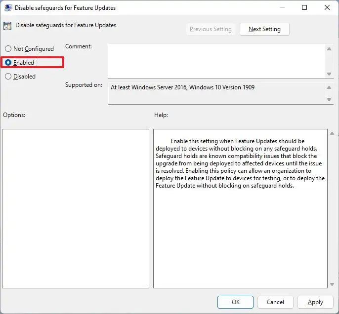 Clique duas vezes na política “Desativar salvaguardas para atualizações de recursos”.