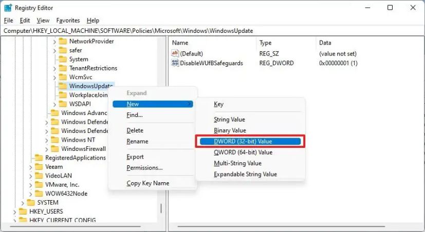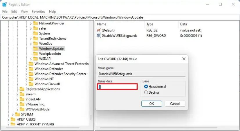 Nomeie a chave DisableWUfBSafeguards e pressione enter.