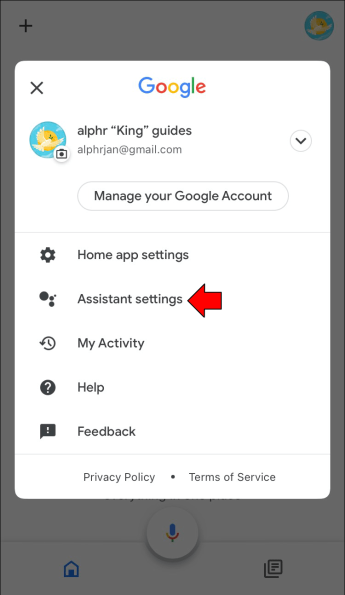 Encontre seu endereço de e-mail e selecione o ícone em forma de seta. (Se você estiver usando o Pixel 4 e versões posteriores, escolha”Ver todas as configurações do Assistente.)