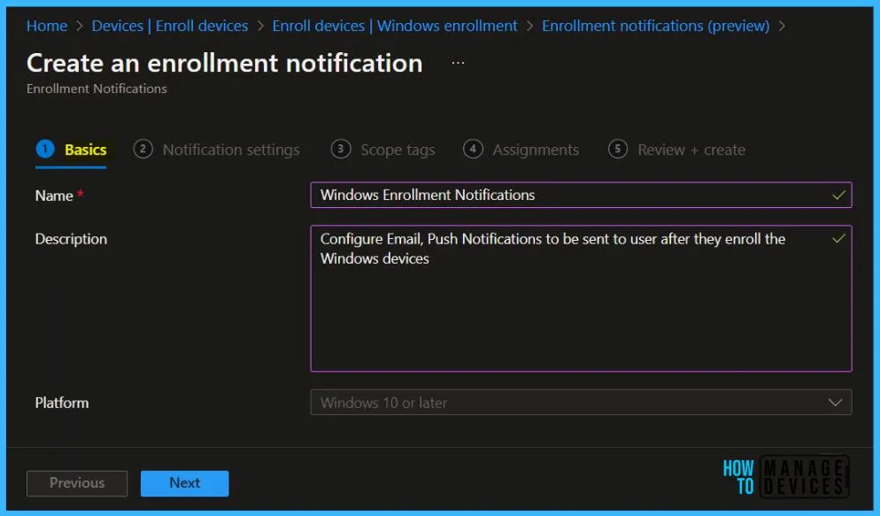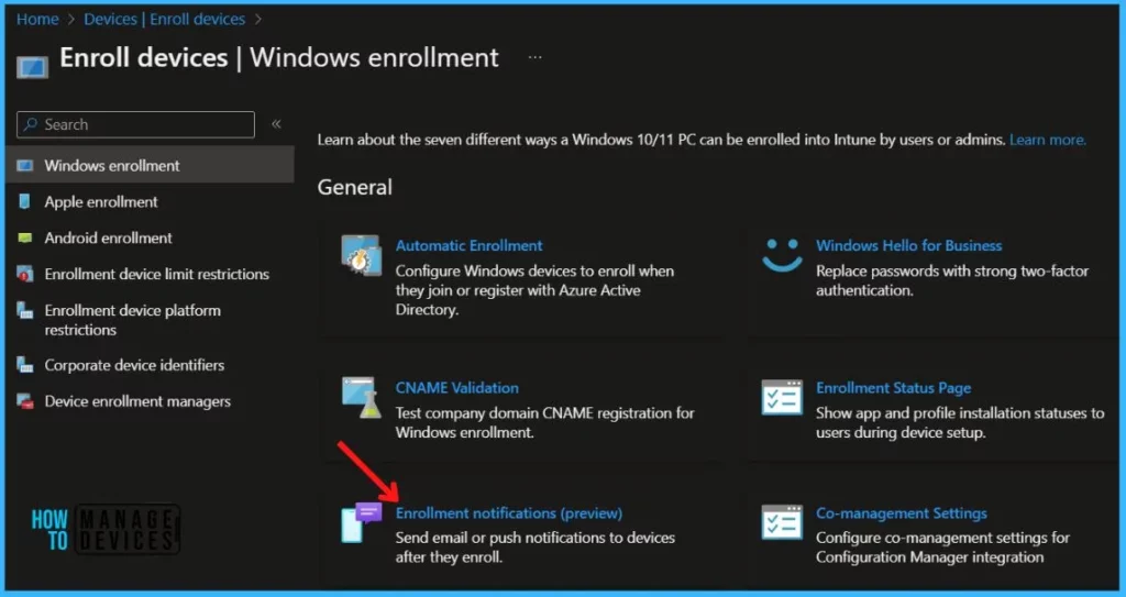 Em Registrar dispositivos, você pode selecionar as opções para Registro do Windows, Registro da Apple ou Registro do Android. Aqui estou selecionando inscrição no Windows e selecione Notificações de inscrição (visualização).
