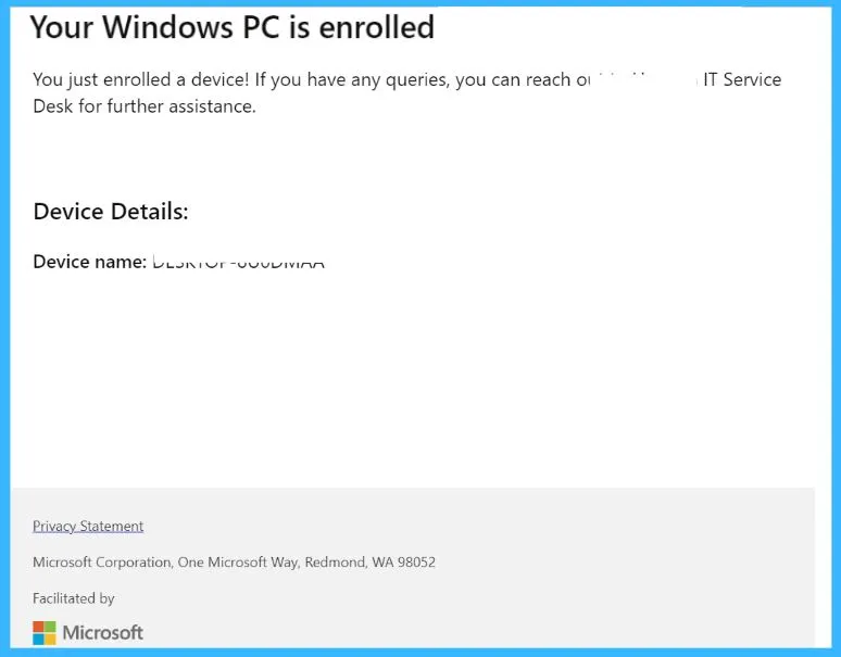 A partir da versão 2209 do Intune Service, os administradores de TI podem criar uma mensagem personalizada e incluir informações na notificação sobre como denunciar um dispositivo não reconhecido. O Intune fornece notificações de inscrição por e-mail ou notificações push.