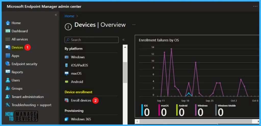 Faça login no Microsoft Endpoint Centro de administração do gerente https://endpoint.microsoft.com/Navigate to Dispositivos > Registrar dispositivo para selecionar a plataforma que você deseja criar a inscrição notificações para.
