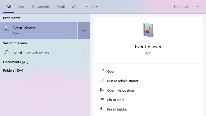 Primeiro, pesquise por”Visualizador de eventos”no menu Iniciar e abra-o.