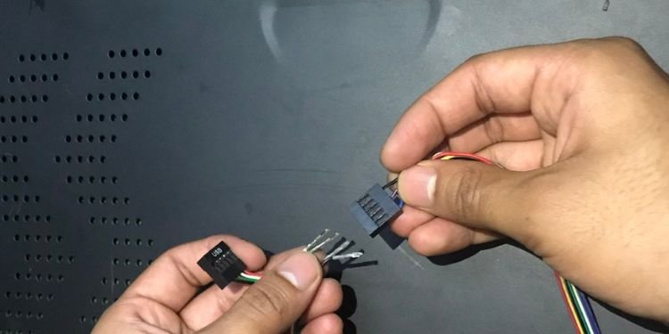 Abra cuidadosamente o gabinete do PC e assegure a conexão correta no painel USB. Em seguida, insira os dois VCC fios no primeiro pino da esquerda do conector USB. Em seguida, conecte os fios DATA-adjacentes aos pinos VCC. Agora, insira os fios DATA+ próximos ao DATA-. Em seguida, coloque os fios GND o quarto pino, deixando o último intocado.