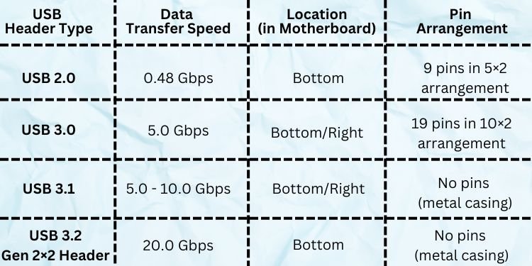 Bem, cada um deles difere com base nos pinos e no número de portas USB que eles podem suportar. Embora a maioria dos cabeçalhos USB possa usar duas portas USB, alguns suportam apenas uma.