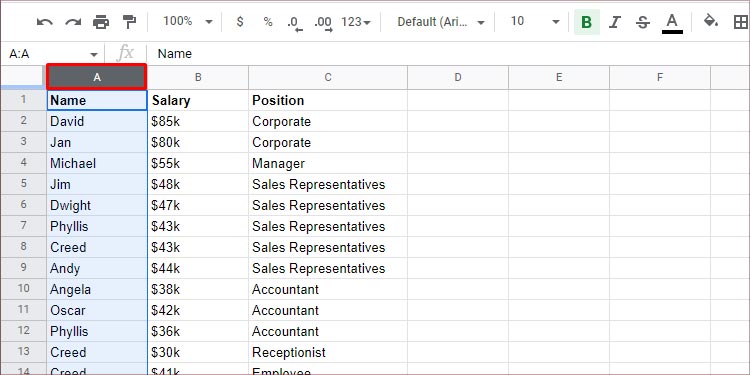 Abra o Planilhas Google no seu navegador.Clique no nome da coluna na parte superior da coluna que você escolher.