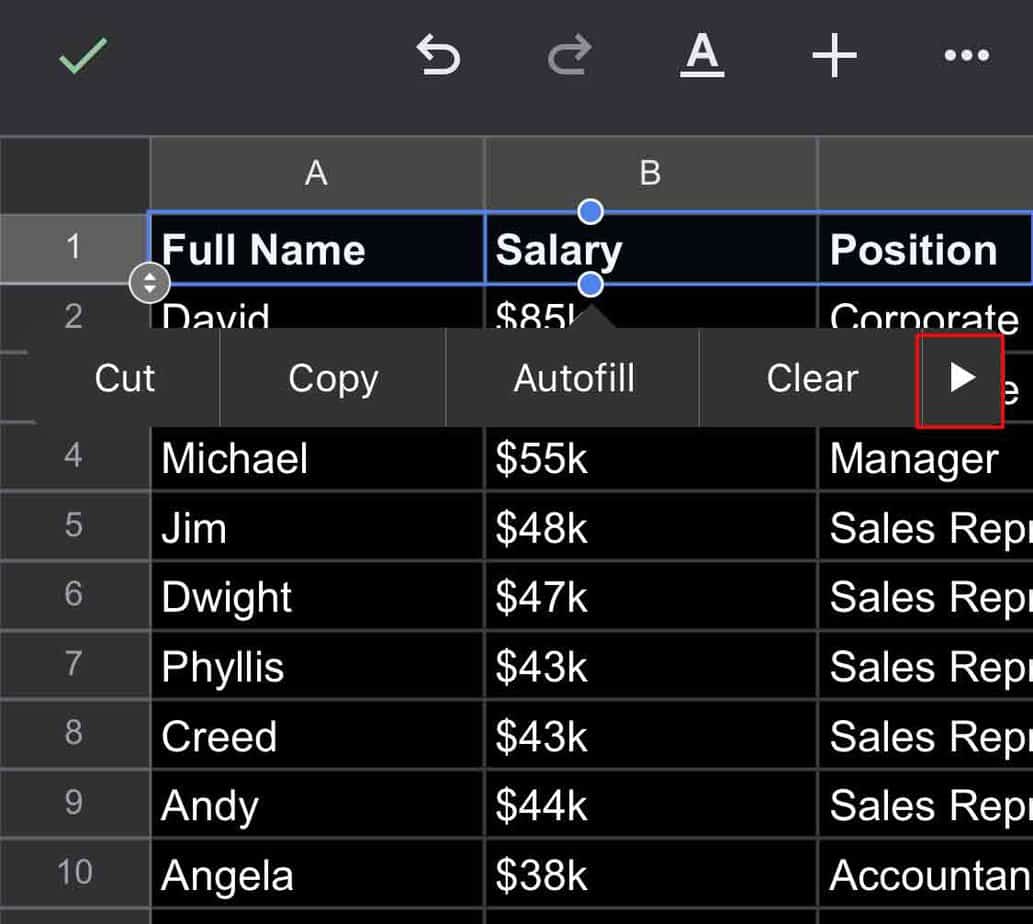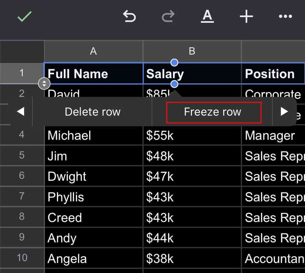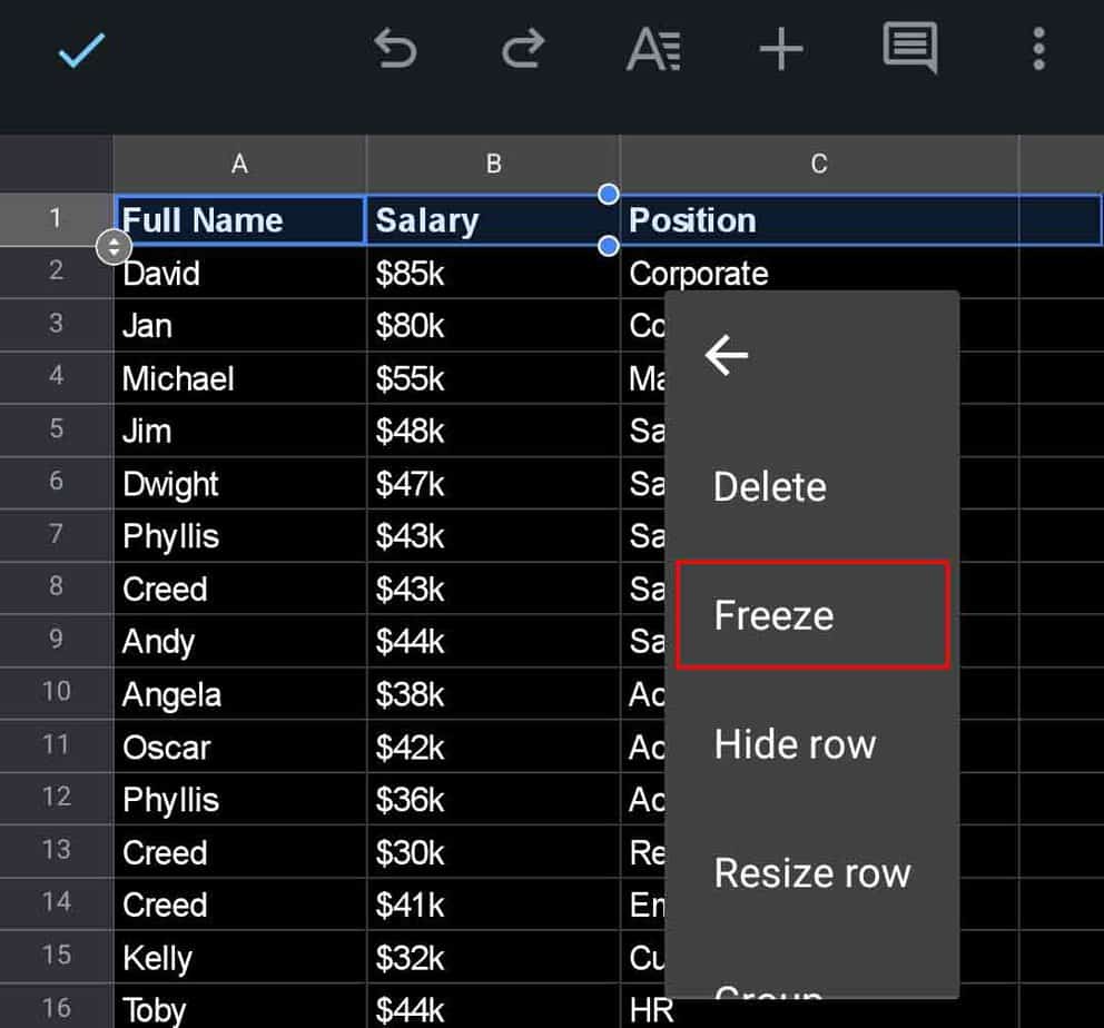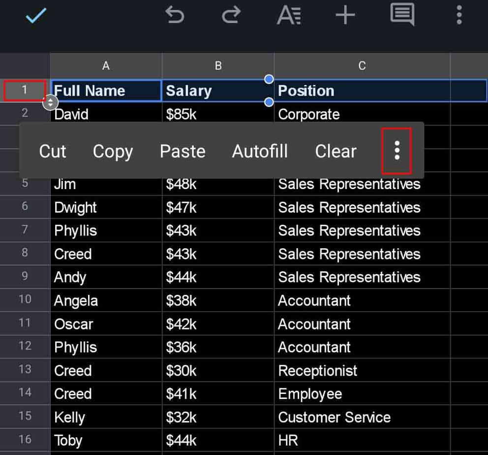 Toque e segure o número da linha com o título da coluna.Toque no ícone de três pontos nas opções pop-up.
