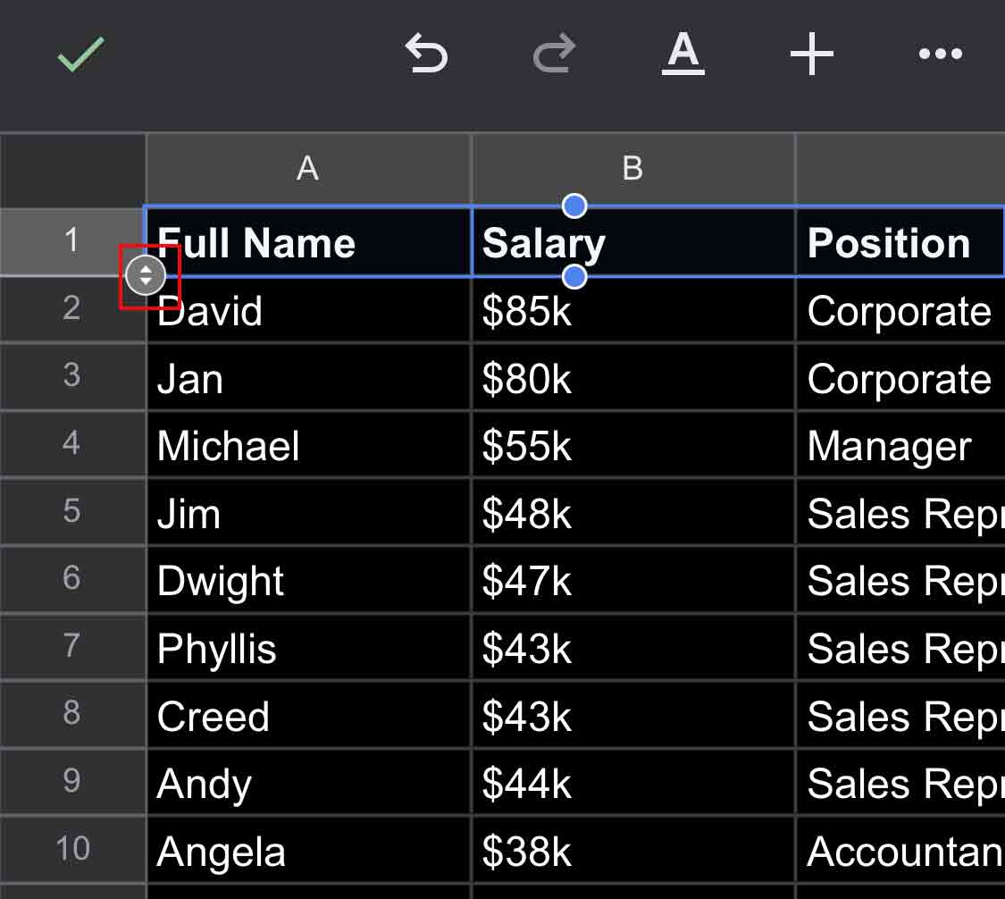Toque e segure o número da linha com o título da coluna.Toque no ícone de três pontos nas opções pop-up.