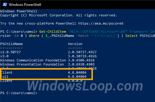 Get-ChildItem’HKLM:\SOFTWARE\Microsoft\NET Framework Setup\NDP’-Recurse | Get-ItemProperty-Nome versão-EA 0 | Onde { $_.PSChildName-Match’^(?!S)\p{L}’} | Selecione PSChildName, versãoVocê verá o número da versão ao lado dos campos”Cliente“e”Completo“. Com isso, agora você conhece a versão.NET instalada.Feche o PowerShell.