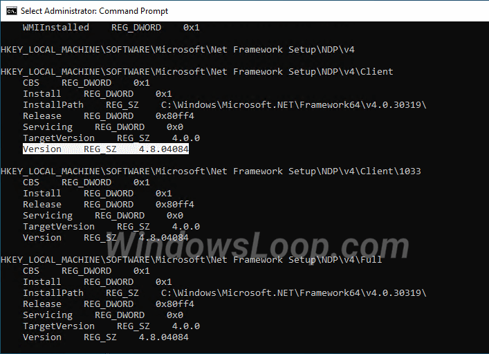 reg query”HKLM\SOFTWARE\Microsoft\Net Framework Setup\NDP”/sVocê verá o número da versão.net ao lado de “ Versão.”Se você tiver várias versões, verá várias entradas. Tenho .NET framework v4.8 instalado strong>.Feche a janela do prompt de comando.