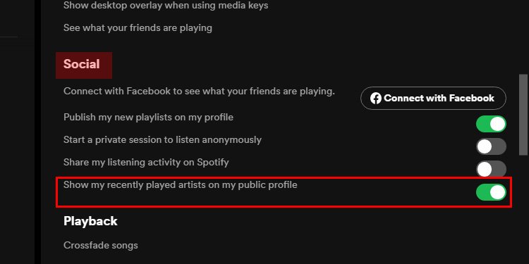 Role para baixo até a seção Social Ative a opção Mostrar meus artistas reproduzidos recentemente em meu perfil público.