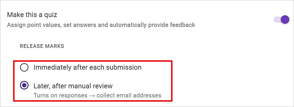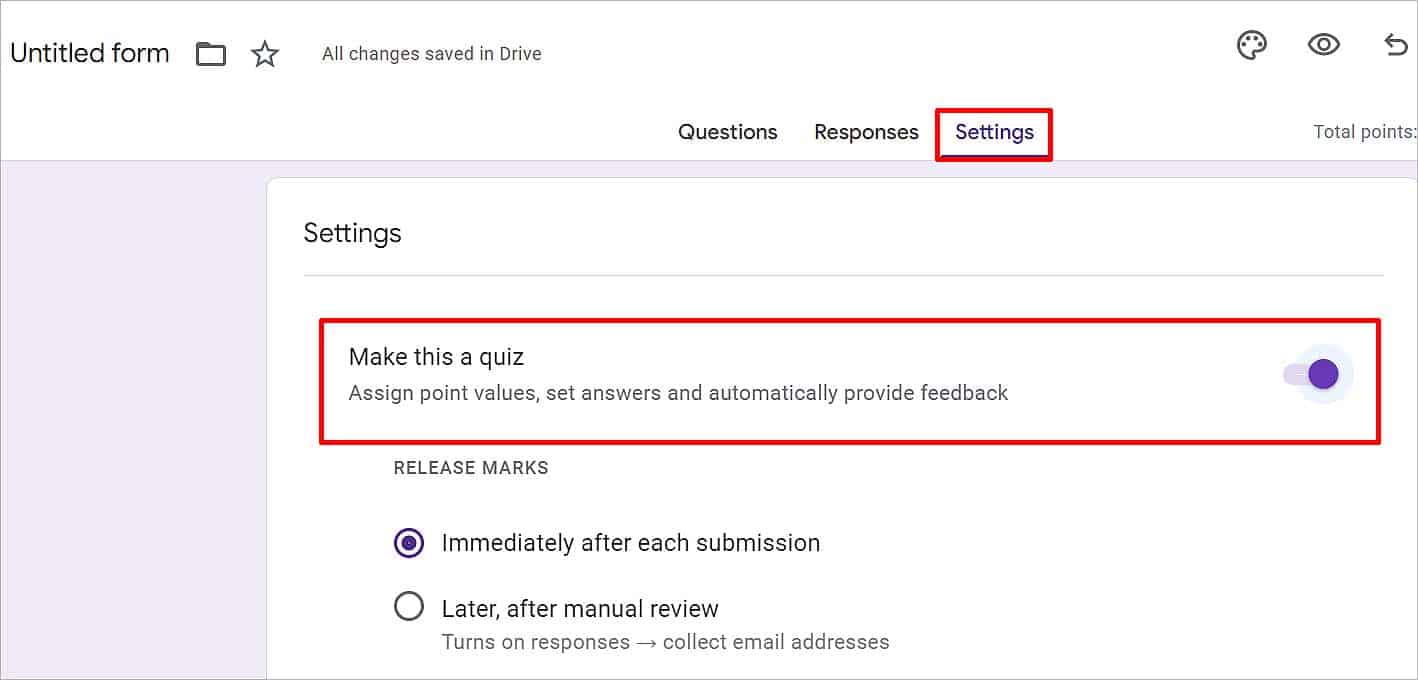 Todos os formulários do Google Forms não são um questionário por padrão. Você terá que ativar a opção”Tornar isso um teste”para definir respostas corretas, pontuações e comentários. Veja como fazer isso.