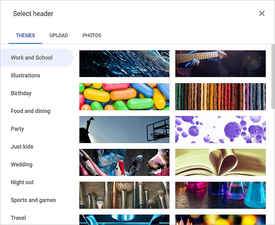 Clique em Escolher uma imagem em Header. As guias Temas, Carregar e Fotos estão disponíveis. Você pode escolher variedades de fotos aqui.