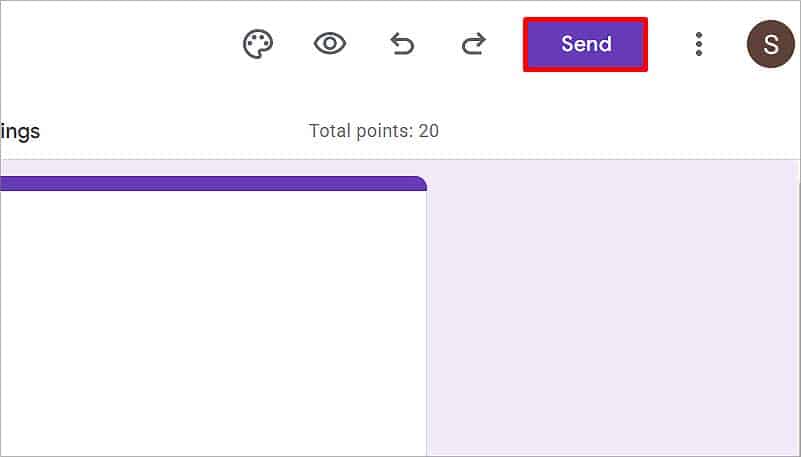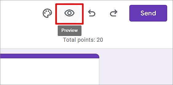 Você também pode visualizar este formulário clicando no ícone Olho no canto superior direito. Se não estiver lá, clique nos três pontos verticais e selecione Visualizar. Aqui você pode ver como os usuários visualizarão o questionário assim que acessarem o link.