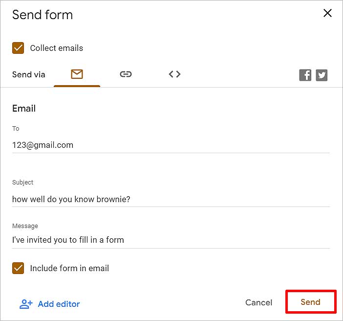 Além de Enviar via, clique no Mail ícone> se você quiser compartilhá-lo usando o e-mail do usuário. Em Email, clique em Para e insira o email do usuário para quem você deseja enviar este questionário. Escreva o Assunto e a Mensagem e ative o formulário Incluir no e-mail se desejar que o questionário seja incluído no e-mail. Clique no botão Enviar no final.
