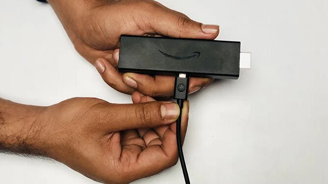 Depois de esperar cerca de 20 a 30 segundos, conecte o cabo Micro USB ao Firestick. Em seguida, insira novamente o Firestick na TV.