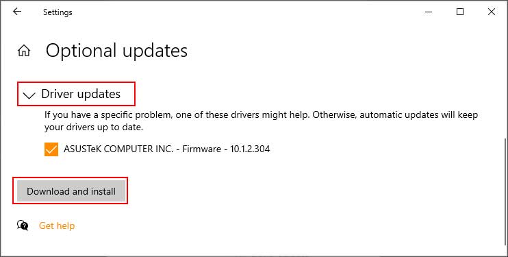 Em seguida, selecioneAtualizações de driver para expandir o menu suspenso. Agora, verifique todas as opções disponíveis e escolha Baixar e instalar.