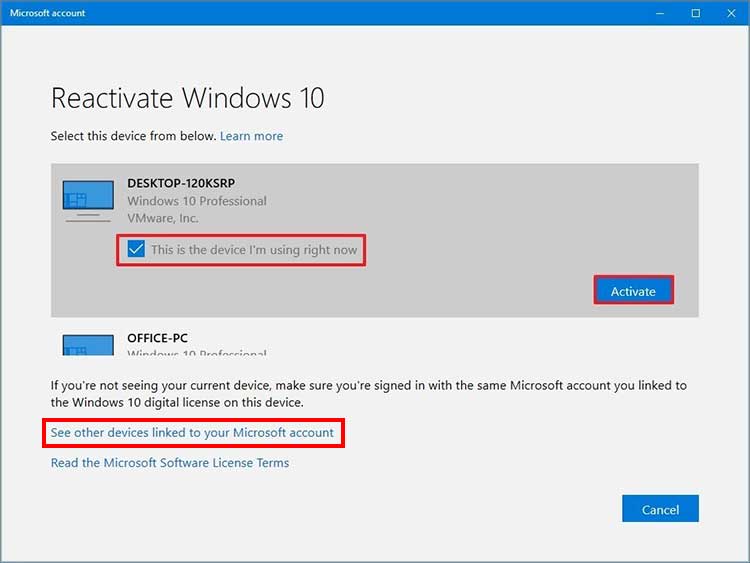 Agora, insira os detalhes da conta da Microsoft e pressione Entrar. Escolha seu dispositivo. Se você não vir o dispositivo pretendido, selecione Ver outros dispositivos vinculados à sua conta da Microsoft e escolha seu dispositivo. Em seguida, você precisa marcar Este é o dispositivo que estou usando agora e pressione Ativar.