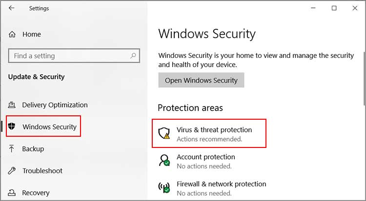 Abra o menu Atualização e segurança e escolha a opção Segurança do Windows. Escolha Proteção contra vírus e ameaças.