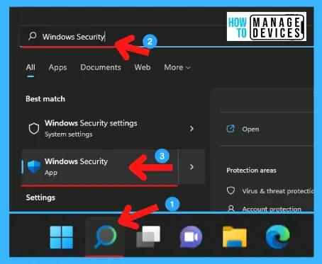 Existem etapas simples para ative a proteção aprimorada contra phishing de senha para proteger sua senha de ser roubada. Siga as etapas para ativar a proteção contra phishing. Primeiro, clique no ícone de pesquisa na barra de tarefas, digite Windows Security e selecione o aplicativo de segurança do Windows.
