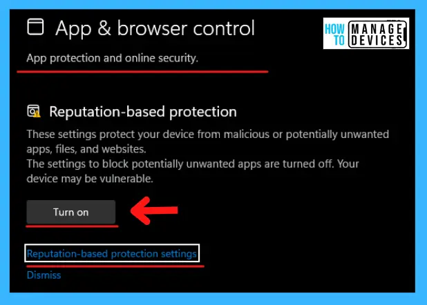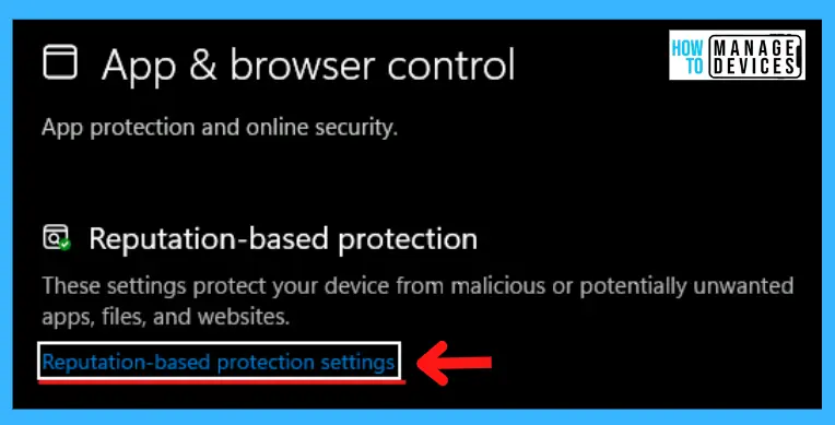 Depois de clicar em App & Browser control agora, você entrou nesta seção. Role para baixo e há uma opção chamada Proteção baseada em reputação disponível. Clique em Configurações de proteção com base em reputação em Proteção com base em reputação.